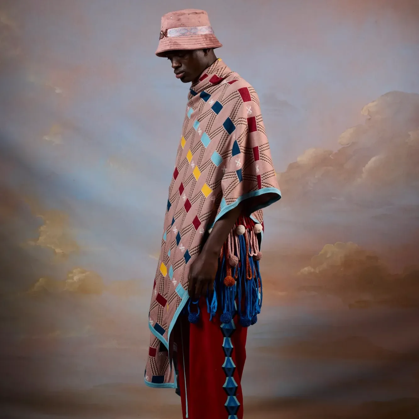 The palette this season: warm oranges, deep blues, and soft neutrals woven together in harmonious rhythm. You could feel the balance between structure and movement in every outfit. Layers of knit, fringe details, and geometric lines gave the pieces depth and motion like the music from singer Zawadi YaMungu flowing through the room.