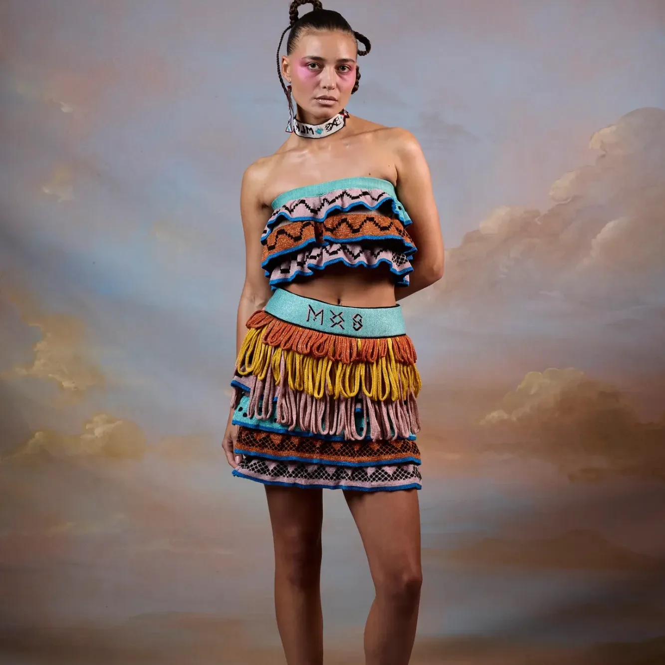 The first look was a total showstopper: a ruffled emerald-green ensemble that moved with rhythm and confidence. Layer upon layer of textured knit created a beautiful sense of volume, while the top with the signature MaXhosa logo added a touch of playfulness. We loved how it flowed with every step.