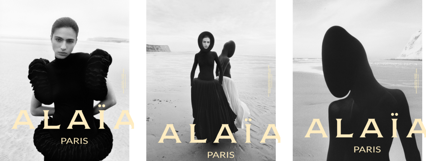 For the first time, the House chose to shoot entirely outdoors. Complementing the photographs are films directed by Frank Lebon, inspired by The Piano, Breaking the Waves, Wuthering Heights, and Barry Lyndon. Set against the rugged northern coastline of France, between Cap Blanc-Nez and Cap Gris-Nez, the campaign transcends time. Here, the Alaïa woman emerges as elemental—pure, powerful, untamed, and free.