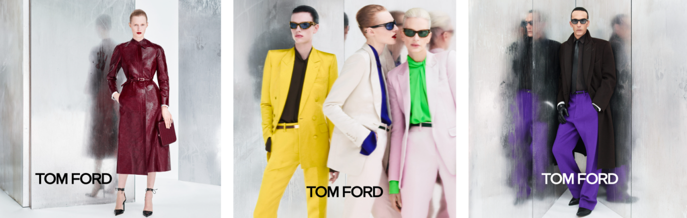 Photographed by Mark Kean, the campaign showcases sharp, vividly colored suits, pared-back accessories, and a sleek metallic silver backdrop. Together, these elements reinterpret Tom Ford’s signature cinematic glamour, allowing the crisp lines and rich tones of the collection to take center stage.
