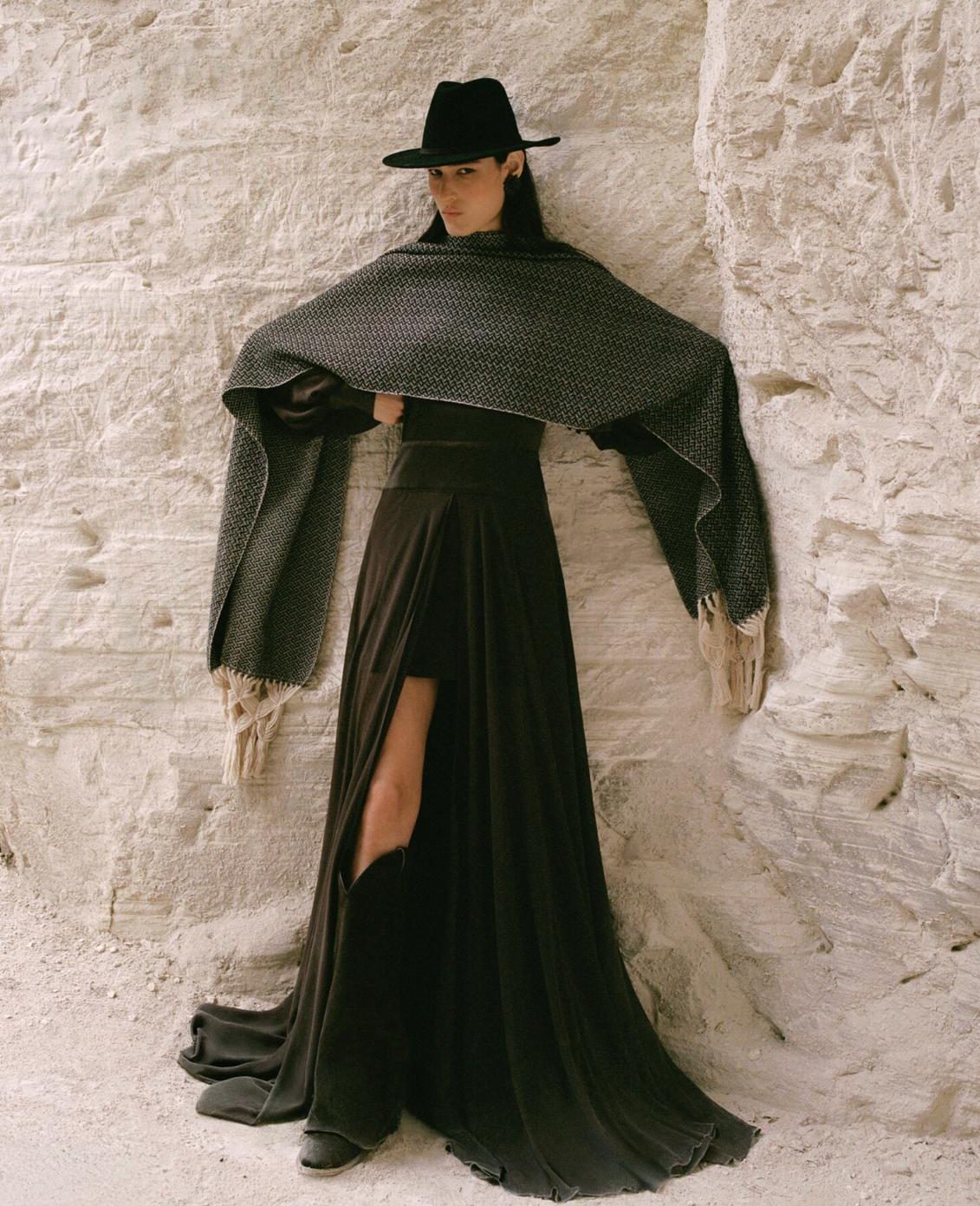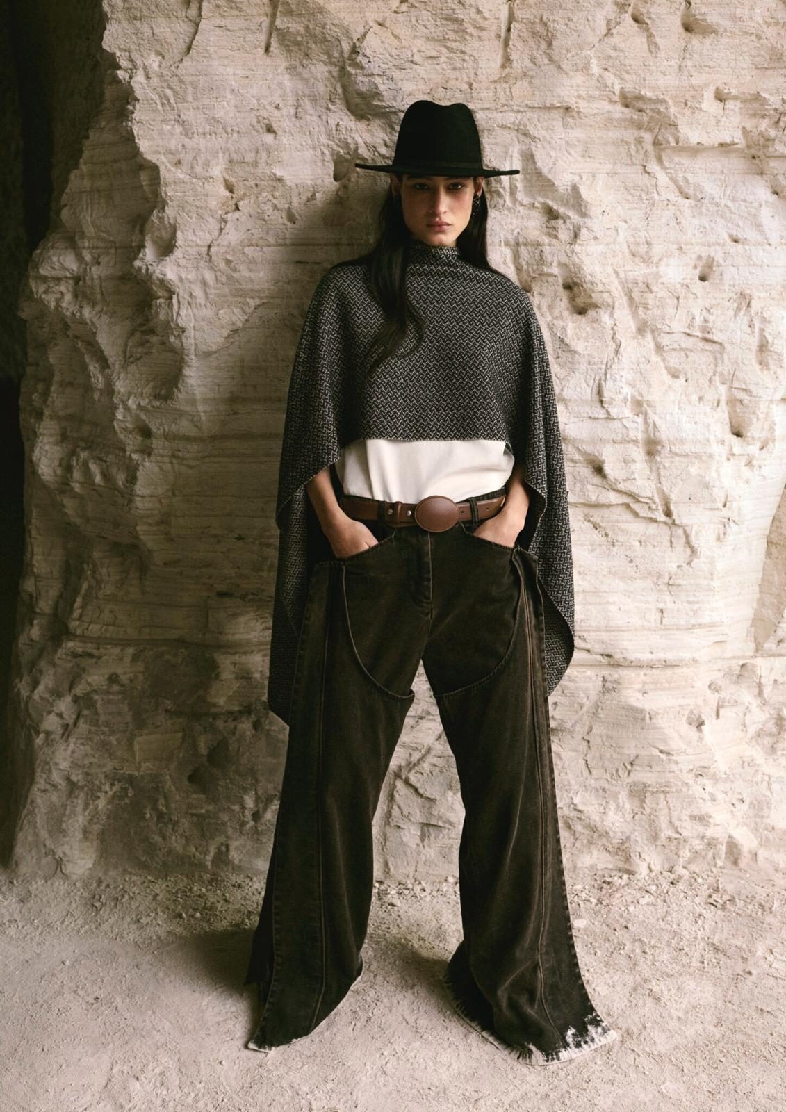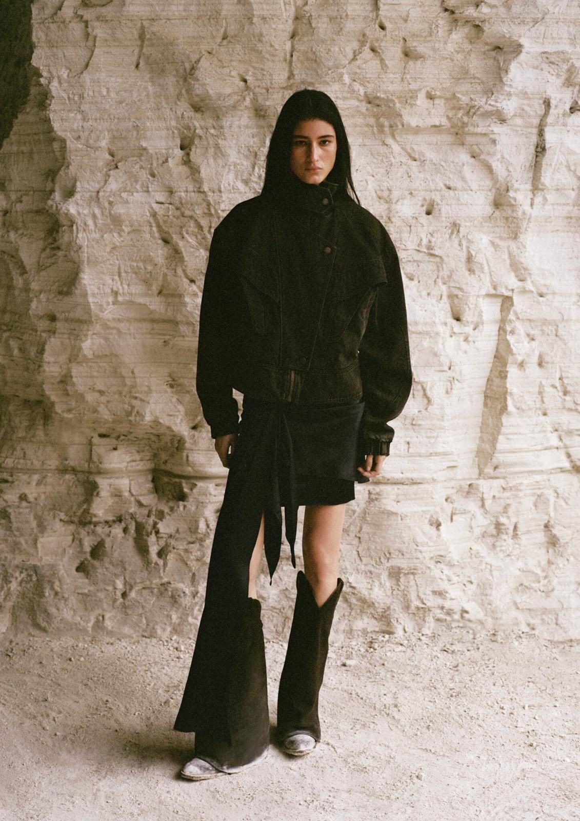 What makes this collection stand out is its use of contrast. Draped fabrics are set against sharply tailored silhouettes; timeless staples are refreshed with a touch of craft. Statement outerwear, cowboy boots, denim jackets, and open-back gowns sit side by side, creating a versatile wardrobe that moves easily between daywear and evening. A restrained palette of black, ivory, and blush is energized with suede tones that echo Mexico’s desert landscapes.